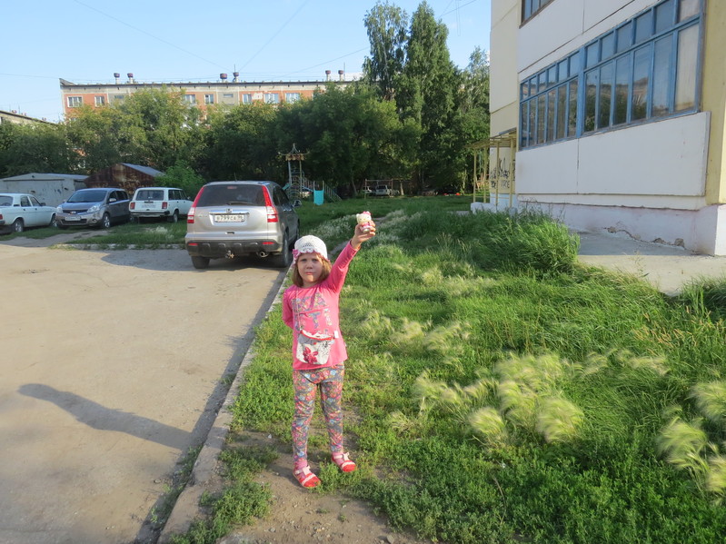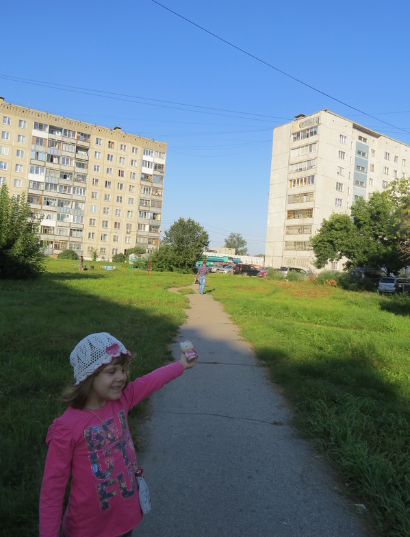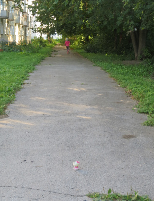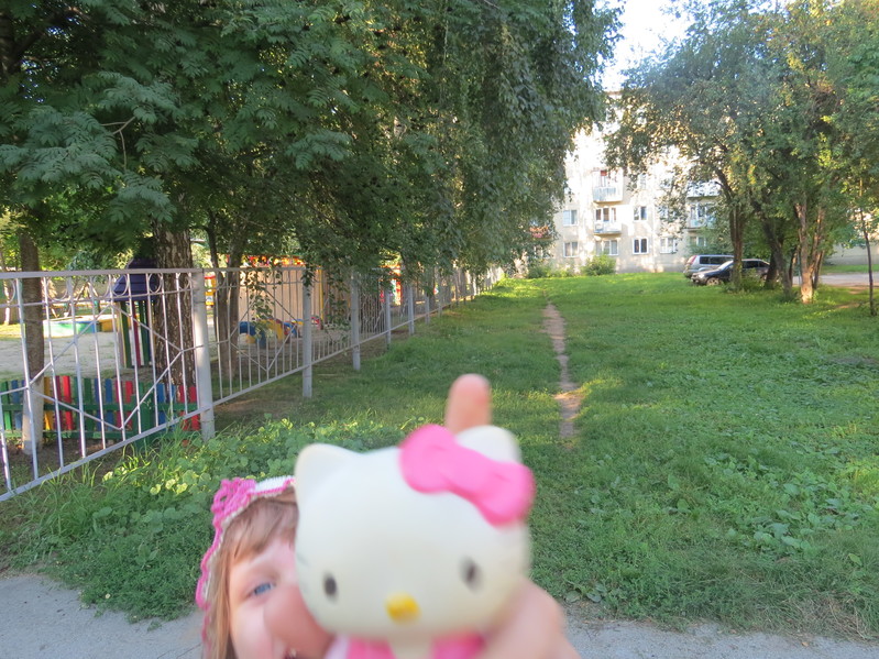 - Четвёртая прогулка Китти получилась снова около дома. В этот раз мы решили вспомнить один наш любимый маршрут, которым мы любили гулять, когда Лизавете было 1,5-2,5 года. Это называлось у нас: "Прогулка прямых дорожек" -- я нашла путь, на котором почти не было пересечений с автодорогами, так что Лизавета могла бегать по этим дорожкам сама. С тех пор Лизавета заметно выросла, "прямые дорожки" оказались совсем короткими. Тем не менее, общий путь прогулки (с возвращением другой дорогой, по соседним дворам) составил опять-таки чуть больше километра, получилось почти столько же, сколько на первых прогулках...