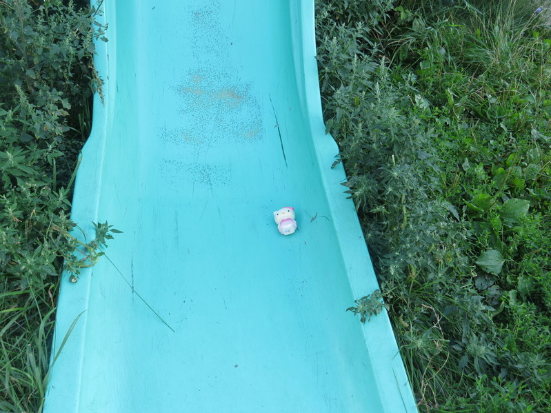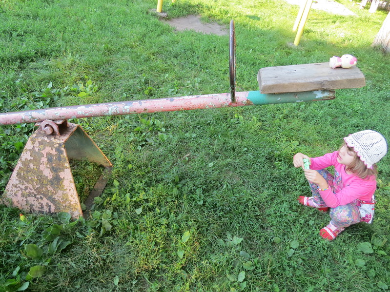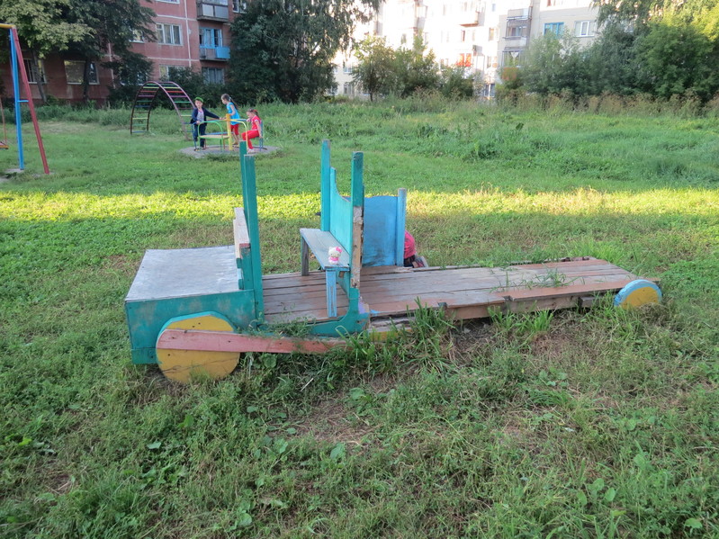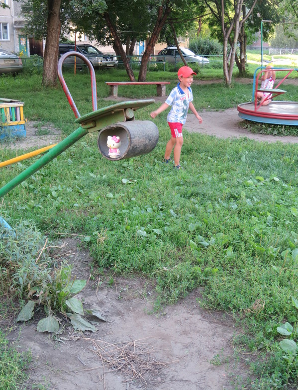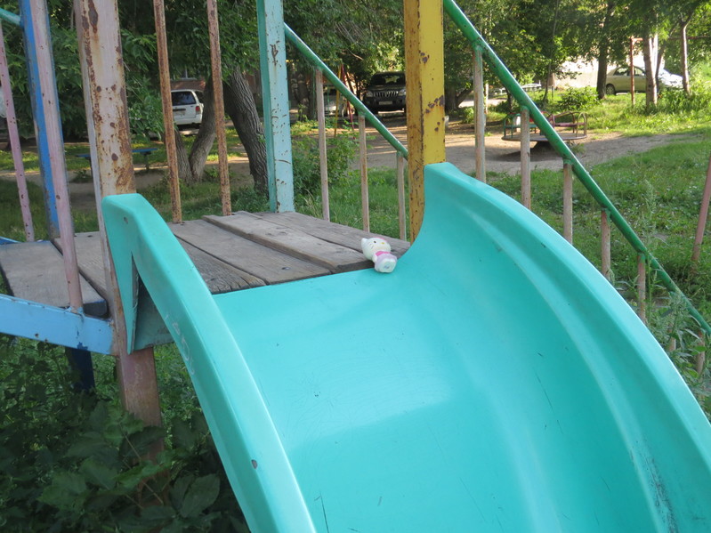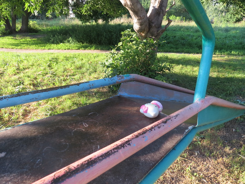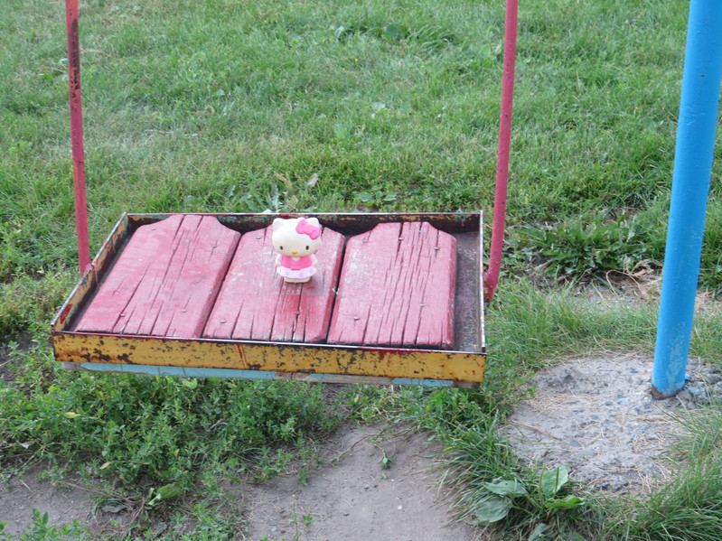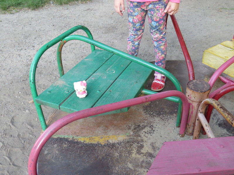 - Китти на останках лазалки-паровозика. Когда-то Лизавета очень любила этот паровозик, но за последние годы его совсем разломали. За паровозиком -- не Лизавета, это ребятишки во дворе играют в прятки...