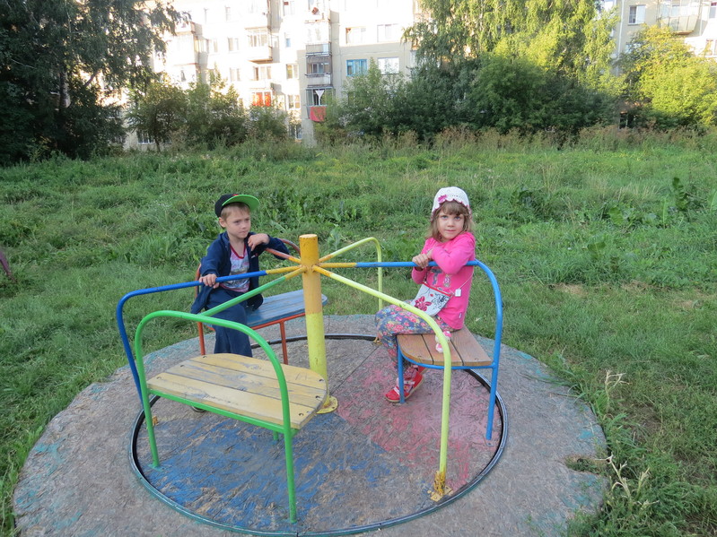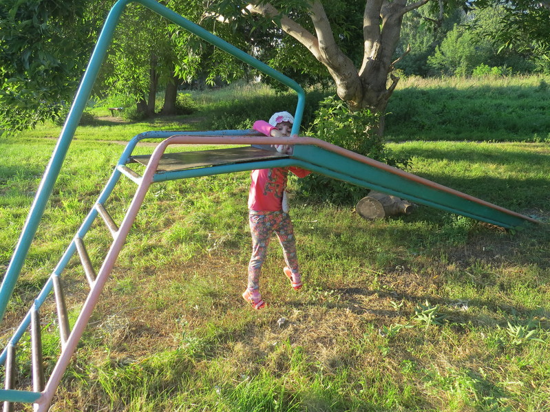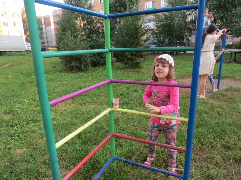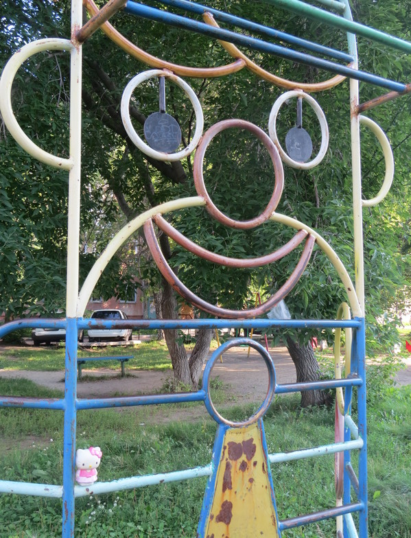 - Перед подъездом Вокзальной-18 тоже есть немного лазалок. На них любят играть ребятишки, уходящие из садика (кто выходит из главного выхода, в эту сторону)... Китти и Лизавета на круглой лазалке...