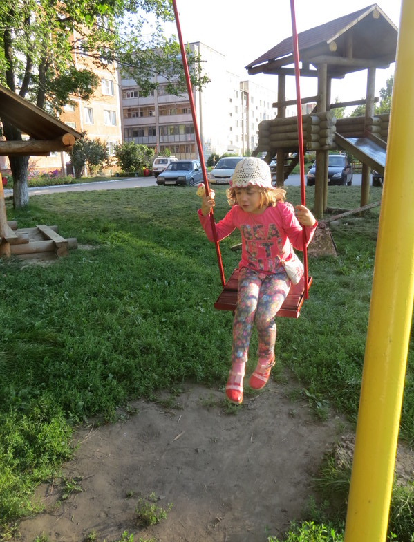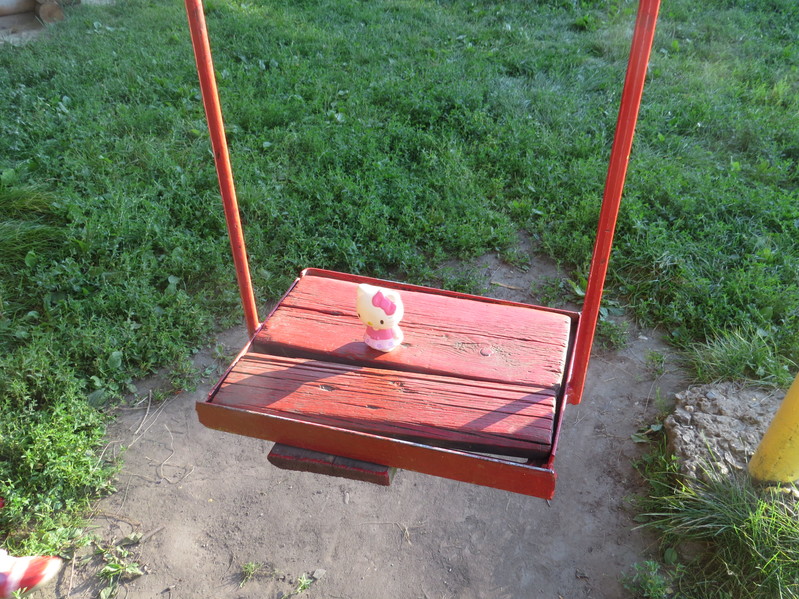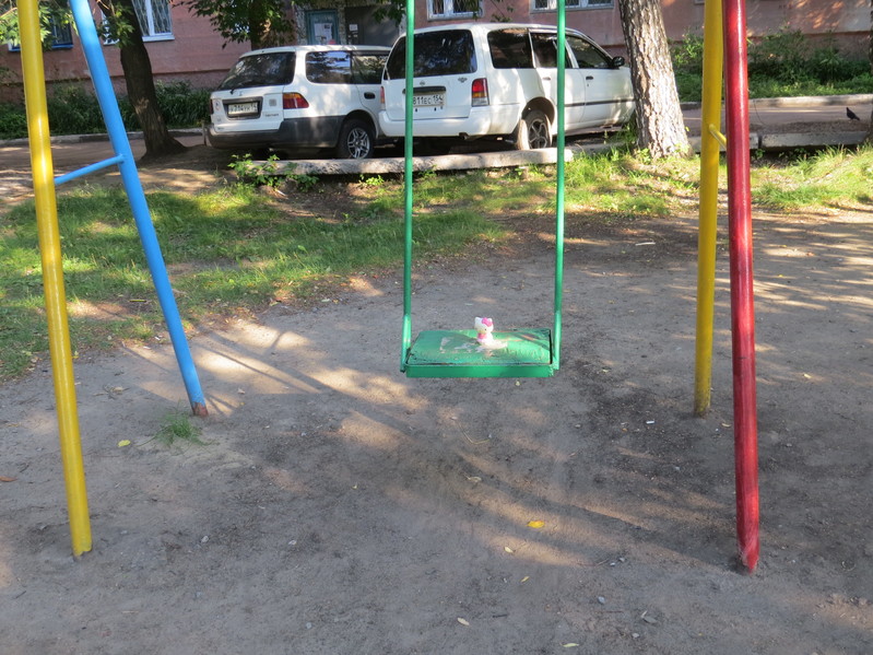 - Китти на стойке качелей, за её спиной -- песочница и ещё одна горка... Это всё ещё наш двор: между Лелюха-3 и Вокзальной-6... На заднем плане виден дом Вокзальная-4 (мы ходили рядом с ним на первой прогулке)...