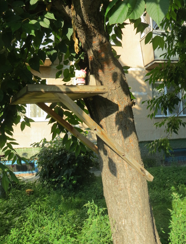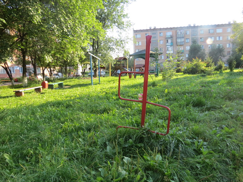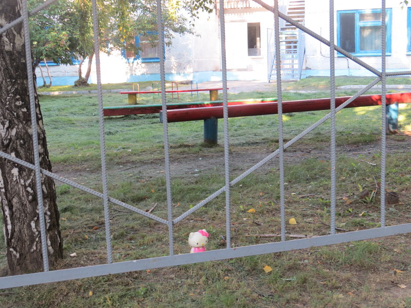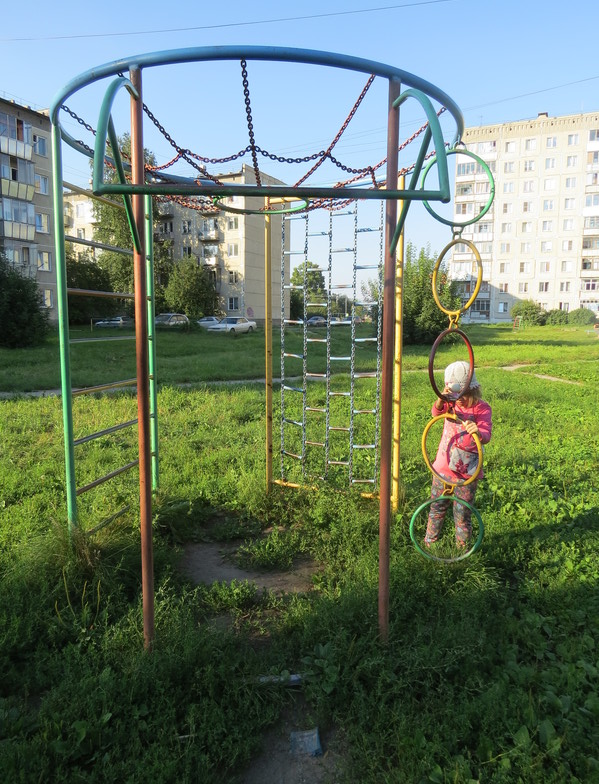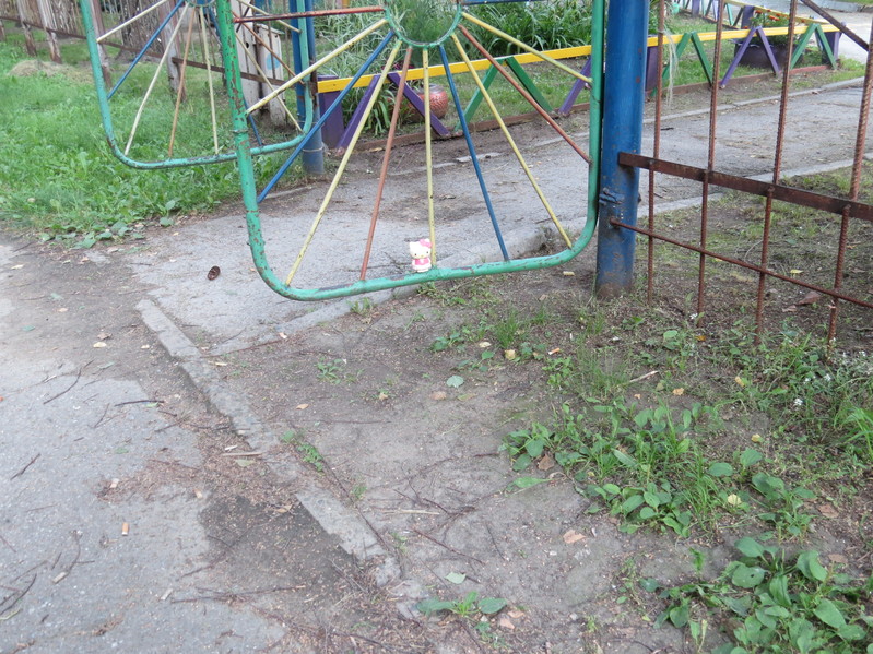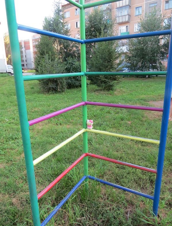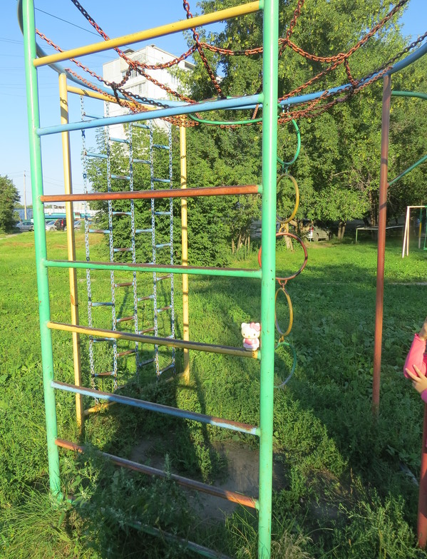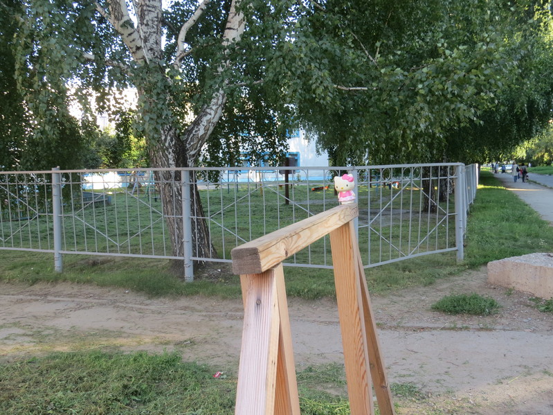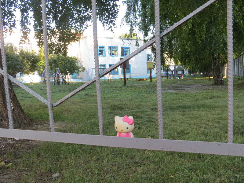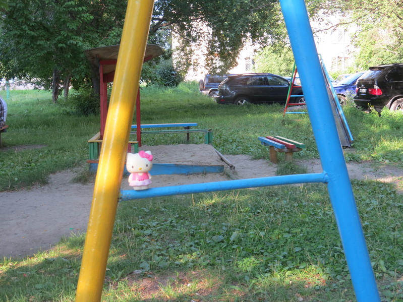 - Лизавета пытается установить Китти на кольцо большой лазалки. На заднем плане справа Вокзальная-24, слева Вокзальная-18, а посерёдке -- угол Вокзальной-14.