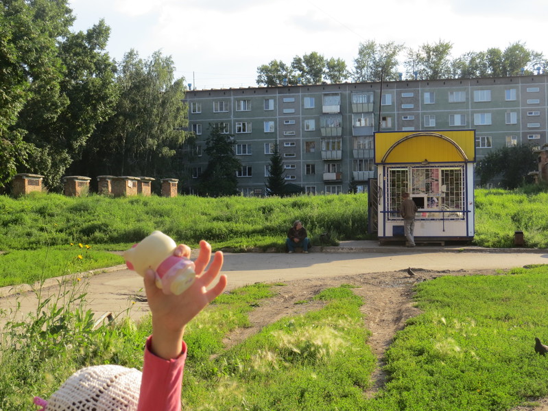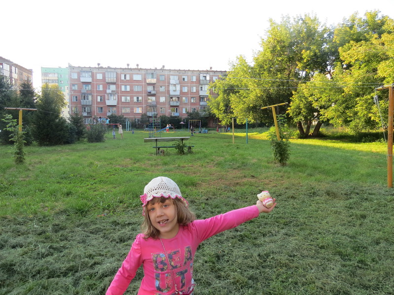 - Лизавета с Китти ещё раз демонстрируют двор. За спиной у них Вокзальная-4, за которой прекрасно виден наш дом (Лелюха-3).