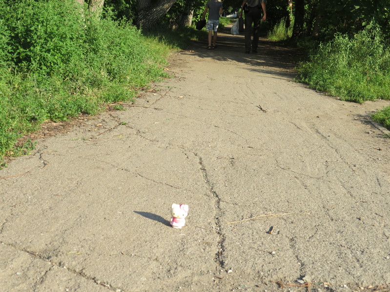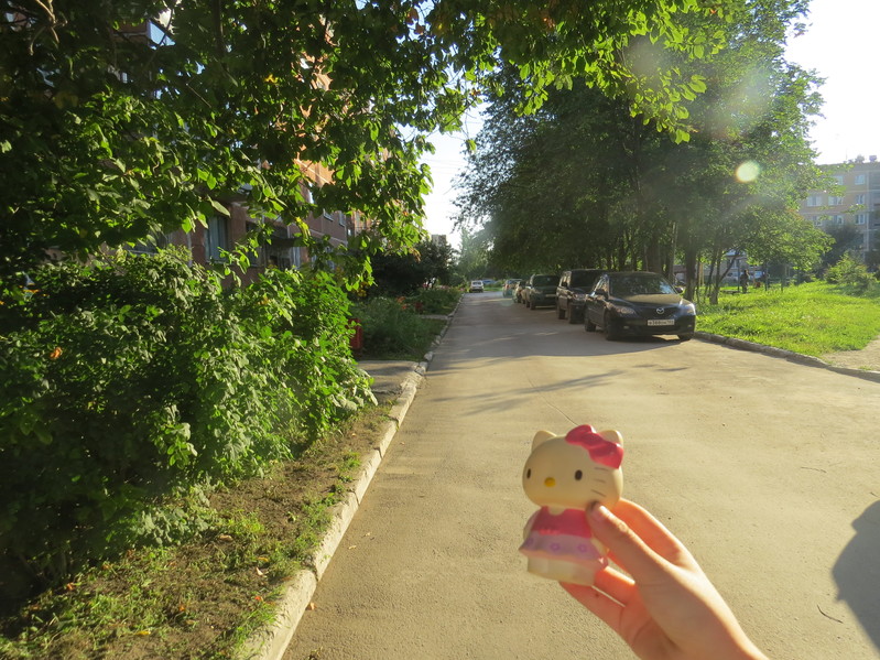 - А вот так -- смотрим в другую сторону. На заднем плане -- Комсомольская, 21. А чуть ближе -- ларёк, который хорошо виден с нашего балкона. А рядом с ним сидит местная сумасшедшая тётка. Она там всё время сидит, когда погода позволяет. Сидит и разговаривает почти всё время. Сама с собой разговаривает, в воздух. Иногда ругается сильно, иногда ведёт себя благодушно (тогда с ней продавщица из ларька даже выходит поговорить)... Ко всему прочему тут видна автомобильная дорога, довольно сильно проездная -- иногда тут объезжают какую-нибудь пробку на трассе даже. А как раз за головой Китти от автодороги ответвляется пешеходная дорожка.