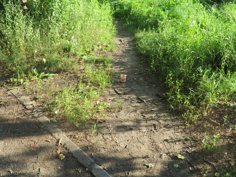 - У этой дорожки есть странные ответвления. Например, вот такой тупичок. Как можно заметить, он упирается в забор. Это забор Экономического Лицея (Комсомольская-29). Я так думаю, там раньше была дырка в заборе и торная дорожка вела в эту дырку. Но сейчас за дырками строго следят (в очередной раз), так что забор тут теперь цельный, а дорожка (даже асфальтированная!) осталась.