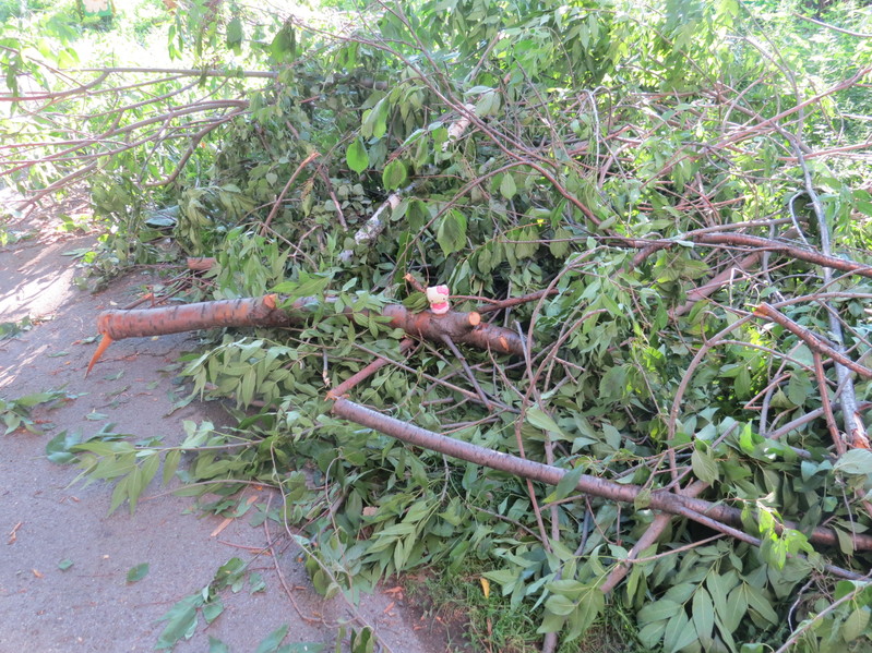 - Рядом с хоккейной коробкой куча срезанных веток -- недавно соответствующие службы обработали двор... Китти на ветках...