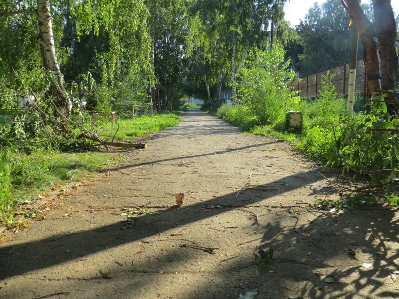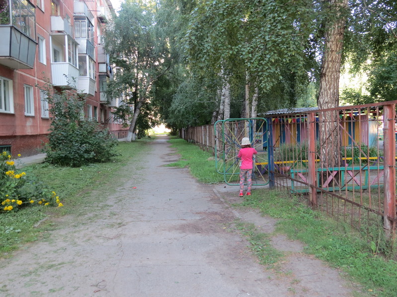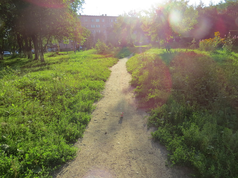 - А мы дошли до конца забора садика, перешли условно-проезжую автодорогу (здесь уже иногда встречаются машины -- за ребятишками в садик приезжают потому что). И у нас возникла "третья прямая дорожка", вдоль тыльной стороны дома Вокзальная-20. Лизавета решила вспомнить детство и побежала вперёд.