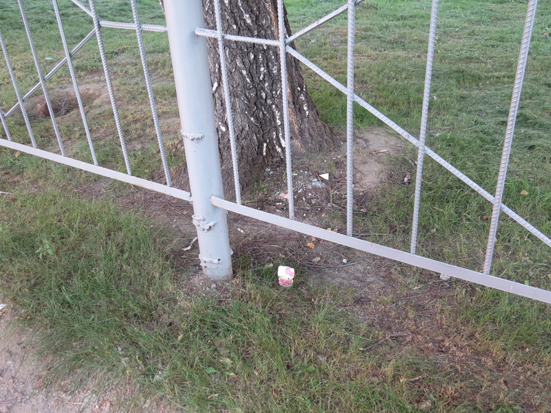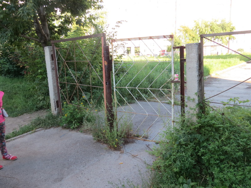 - На углу школьного забора можно увидеть ещё артефакт, гласящий, что раньше на школьный двор можно было зайти откуда угодно. Тут уже не просто тропинка, а проезжая дорога заасфальтирована. Однако ворота, на которых стоит Китти, сейчас заварены напрочь, они никогда не открываются. (Хотя даже с 1,5-годовалой Лизаветой мы вполне ходили через эти ворота на школьный двор...)