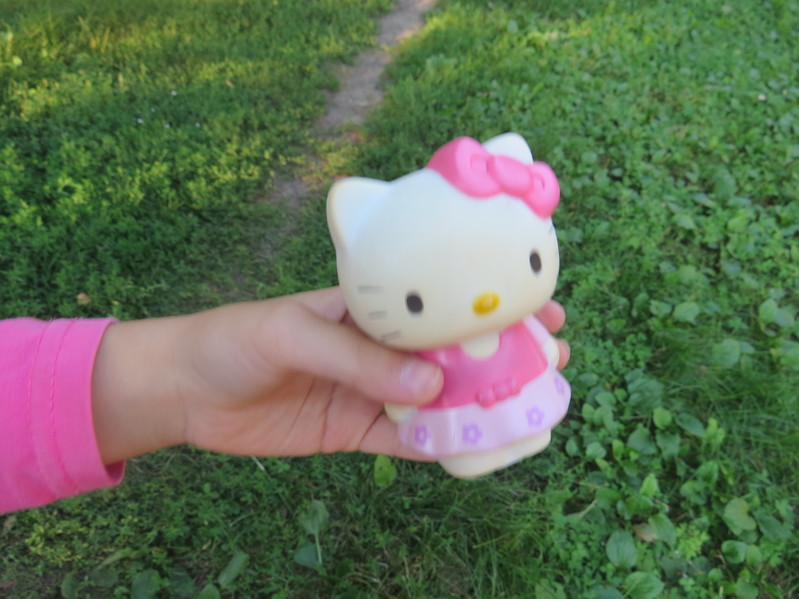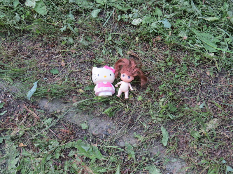 - Мы стали возвращаться от садиковой калитки к нашим дорожкам. И тут внезапно, в скошенной траве, нашлась кукла. Китти позвала куклу дальше гулять вместе...