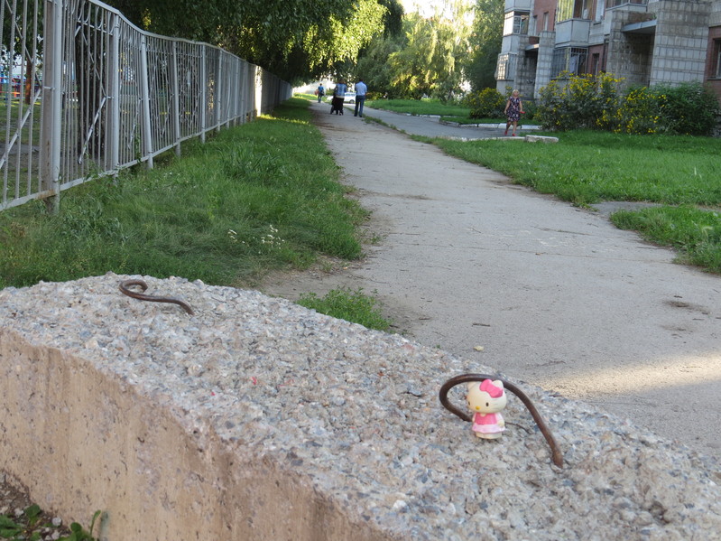 - Мы немного свернули вбок от нашего маршрута, вдоль дома Вокзальная-10, чтобы дойти до калитки детского сада, через которую мы каждый рабочий день ходим с Лизаветой... Здесь Лизавета пытается установить Китти на калитку.
