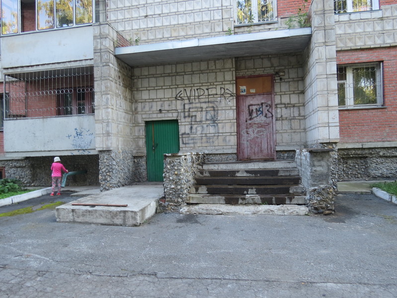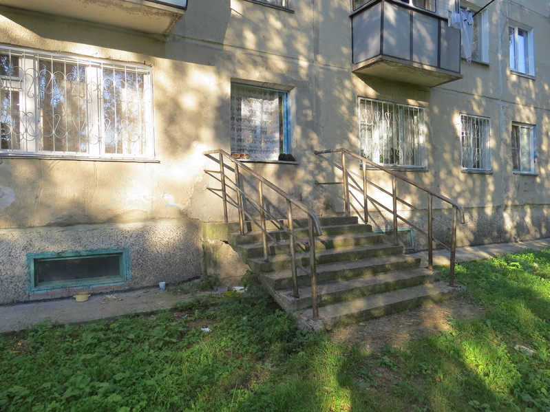 - Вообще, дом Комсомольская-27 имеет какую-то странную конфигурацию. Я уже говорила, что реальные подъезды у него находятся с другой стороны. Но с тыльной стороны тоже есть вот такие крылечки. Правда, двери тут наглухо заколочены или закрыты на замок. Удивительно.
