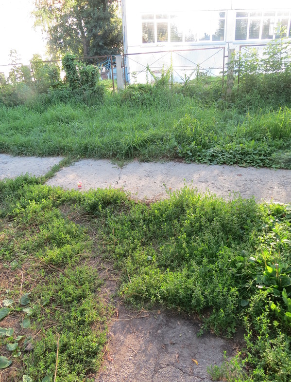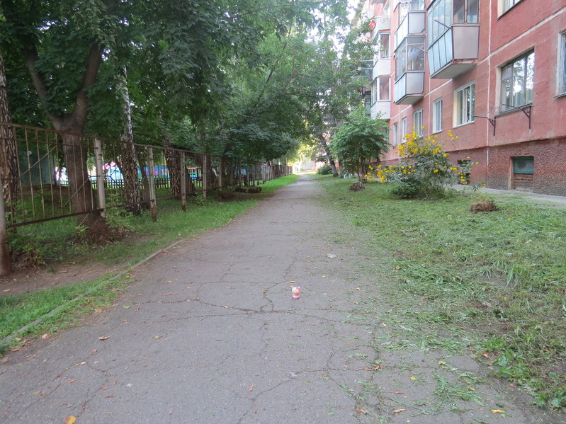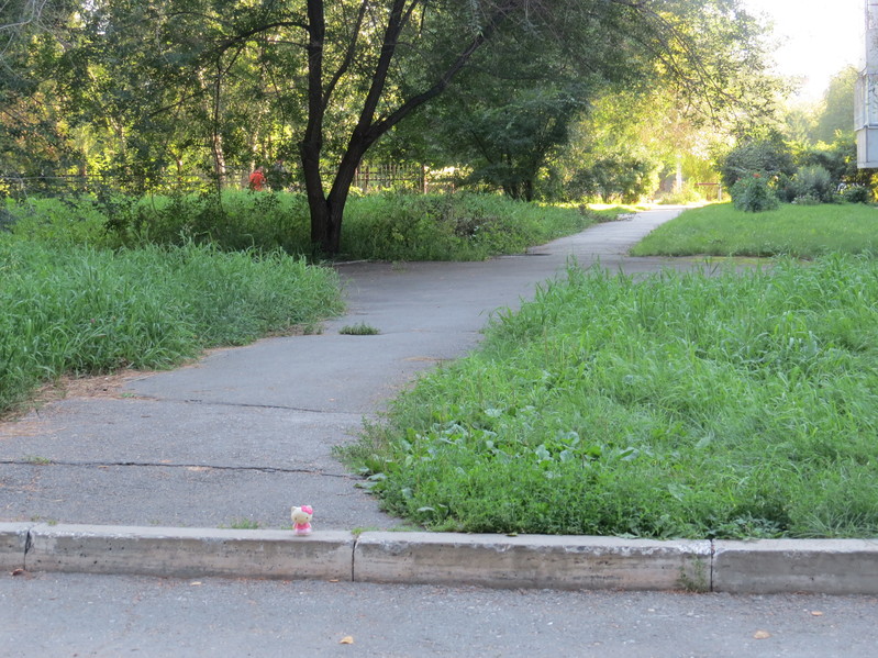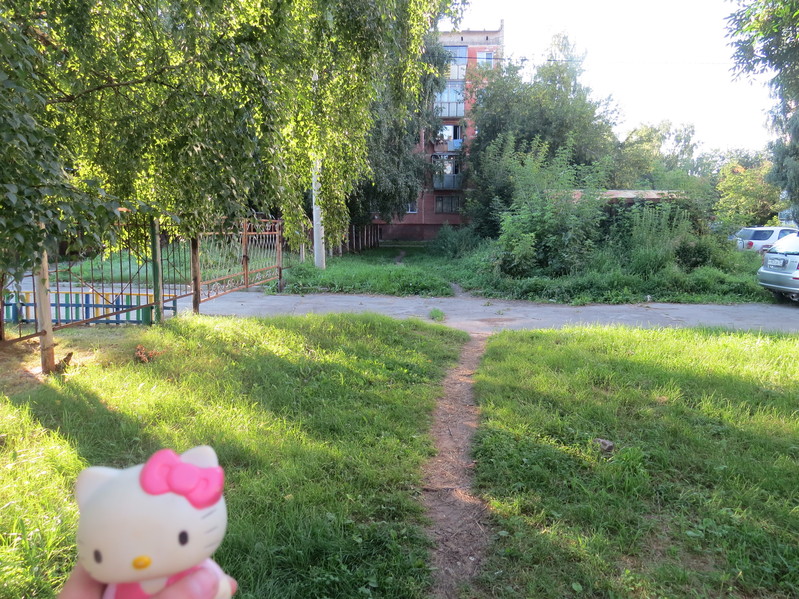 - Китти на дорожке во дворе. Это большой и сильно заросший растительностью двор (но и игровая площадка на нём обширная). Двор практически квадратный, образован домами Вокзальная-8 (виден впереди), Вокзальная-10 (слева от нас), Вокзальная-6 (справа от нас) и Вокзальная-4 (у нас за спиной)...