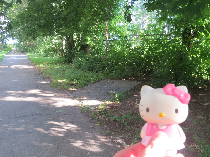 - Китти на дорожке между оградой садика и Вокзальной-10. Мы сегодня уже заходили на эту дорожку, только с другого её конца.