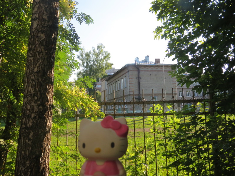 - Теперь Китти на перилах мостика. За её спиной -- детский садик "Красная Шапочка". В этот садик ходит Лизавета.