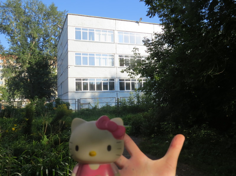 - А это тоже Китти на фоне школы. Только это уже другая школа. Средняя школа номер 2 ("Спектр"), Комсомольская-31. Школа номер 2 и Экономический Лицей находятся в одном школьном дворе, между ними даже забора нет. (Наверное, Лизавета когда-нибудь будет ходить в одно из этих учебных заведений, даже ещё не ясно -- какое.) А вот относительно нашей "третьей прямой дорожки" получается, что Экономический лицей остаётся справа, а Школа 2 получается прямо впереди и дорожка заканчивается перед её забором.