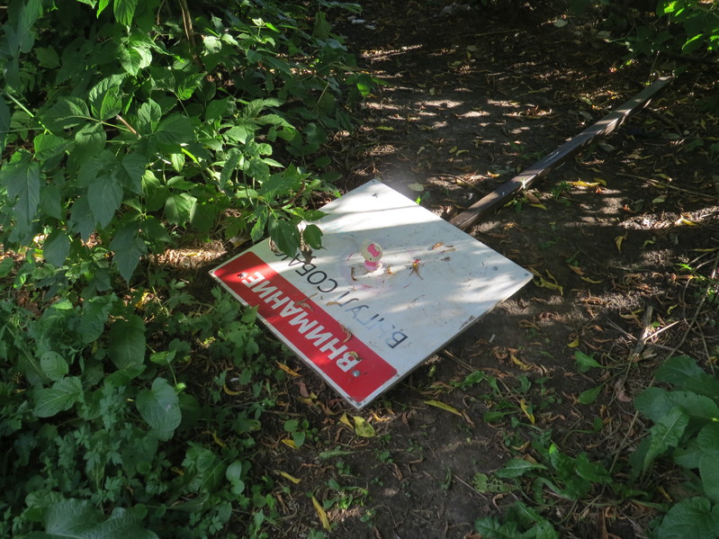 - Китти на сломанной табличке, запрещающей выгул собак. Кстати, здесь реально, видимо, следили за этим запретом. Потому что ещё несколько лет назад эта дорожка представляла собой "минное поле" -- кажется, всех окрестных собак сюда водили выгуливать. Но сейчас дорожка чиста.