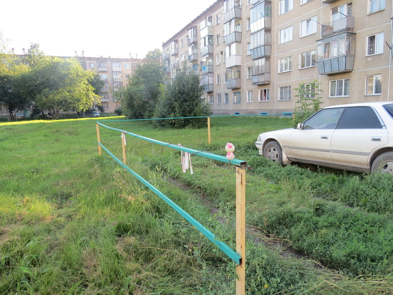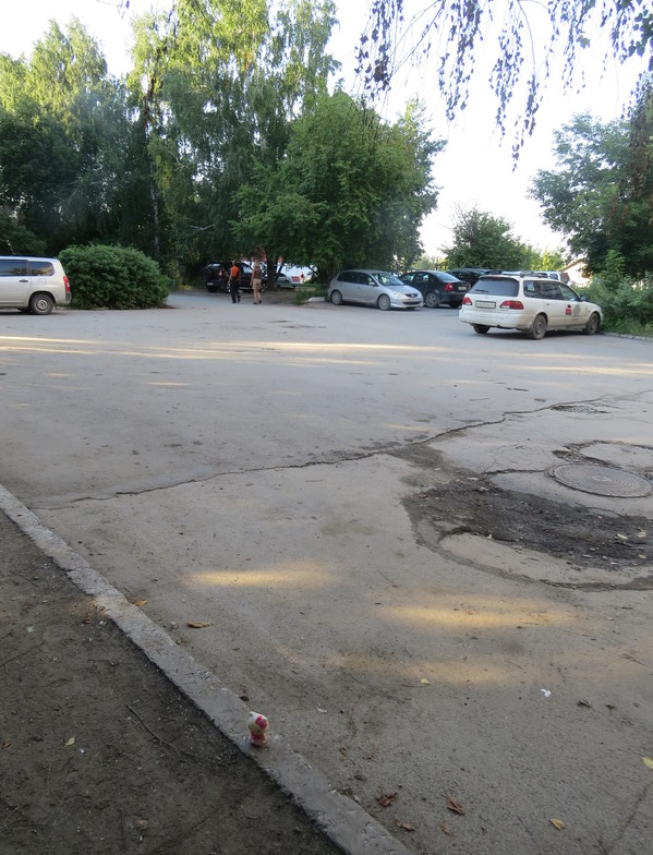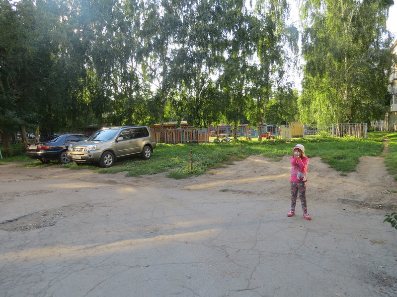 - Двор Вокзальной-20. В очередной раз заборчик с проходом, огораживающий парковочную зону... За спиной Китти детская площадка в большом дворе. Совсем на заднем плане -- Вокзальная-24.