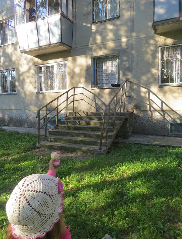 - А справа, в Вокзальной-14 есть такая квартира, где живут кошки. Вот на этом крылечке обычно бывает прямо много кошек. Но сейчас Китти видит их только две...