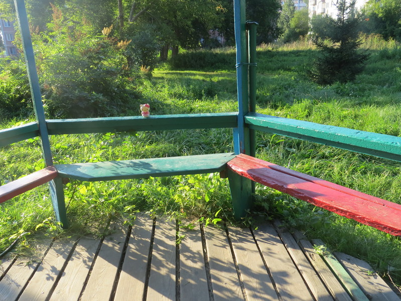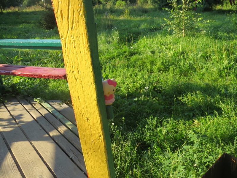 - Китти в беседке. Это очень знаменательная беседка! Годовалая Лизавета долго не хотела (боялась) самостоятельно ходить на улице, хотя дома уже вовсю бегала. Именно в этой беседке она решилась походить по полу (потому что под крышей), ну, а потом уже и из беседки выйти рискнула... Мы регулярно ходили с маленькой Лизаветой в эту беседку, когда гуляли, слушали там капель и птиц, прятались от снегопада и дождя... Сейчас редко в неё заглядываем...