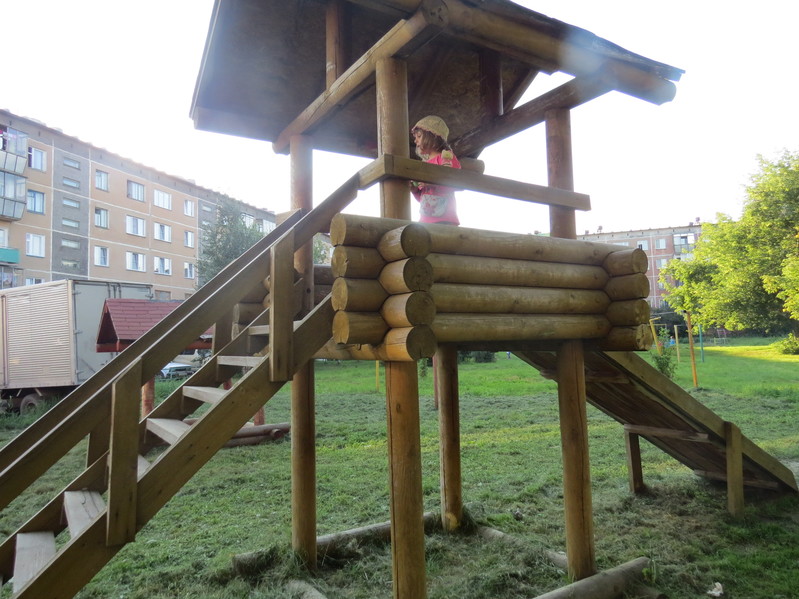 - Китти на старой, сломанной лазалке. Вдали беседка и группа лазалок из брёвен... А дальше -- угол домов 10 и 8...