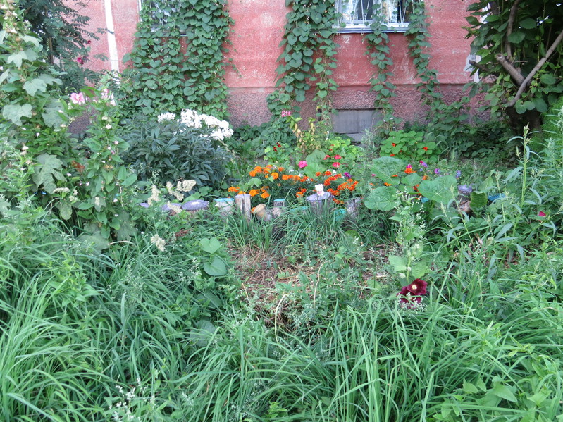 - Китти на ограде цветочной клумбы у дома Вокзальная-6. Клумба в этом году совсем заросла, её было совсем не видно, потому что в этом углу двора траву долго не косили. Незадолго до нашей прогулке траву тут несколько примяли и мы снова увидели эти буйные цветы...