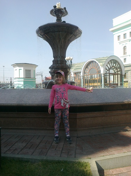 - А это уже Новосибирский вокзал. Китти и Лизавета на фоне фонтана, находящегося между пригородным и междугородним вокзалами Новосибирска.