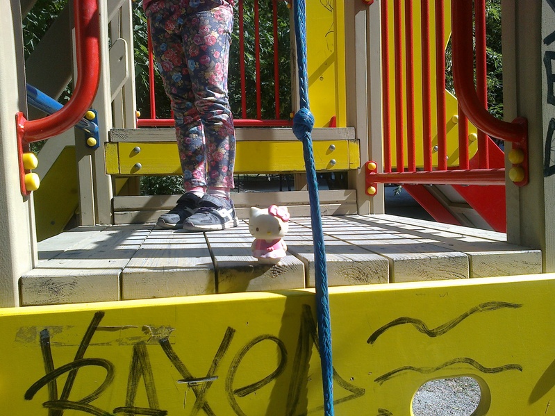 - Китти и ноги Лизаветы на лазалке где-то во дворах, в районе домов Шамшурина-10 и Ленина-55 (недалеко от железнодорожного вокзала).