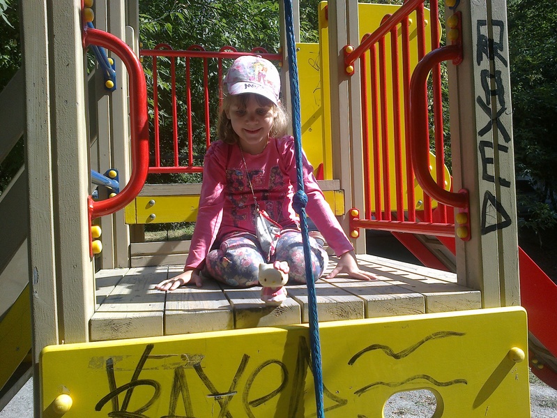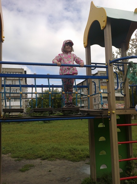 - Лизавета на лазалке в парке 11-го квартала. За её спиной видны дома 2 и 3 этого же квартала. А если бы между ними не было кустов, то можно было бы увидеть школу номер 6 (ул. Закраевского, 84)...
