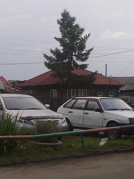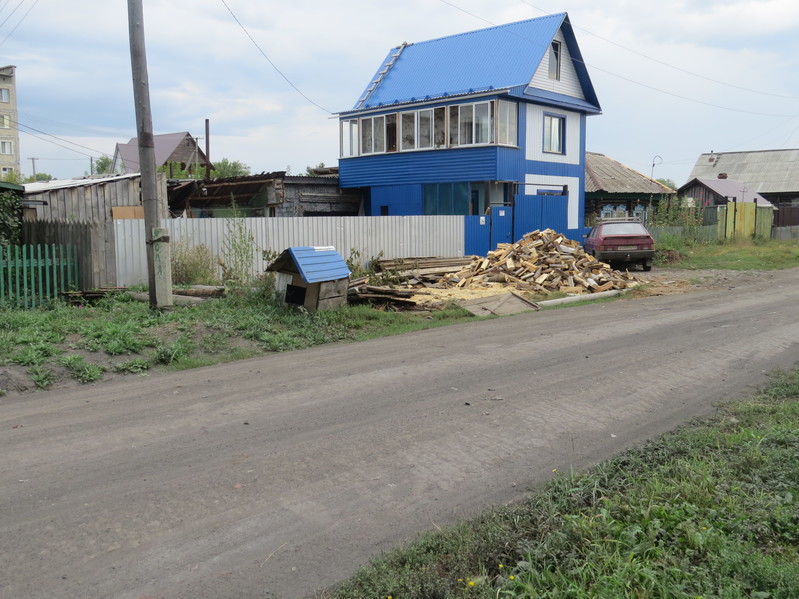 - Вид на синий дом Лермонтова-14 и собачью будку, крытую тем же синим шифером, да и вообще выполненную в том же дизайне, что и дом, с белыми фрагментами... На левом краю кадра виден угол бабушкиного дома 15-4...