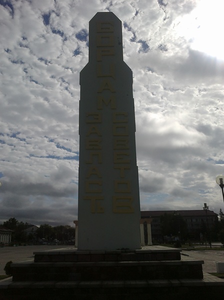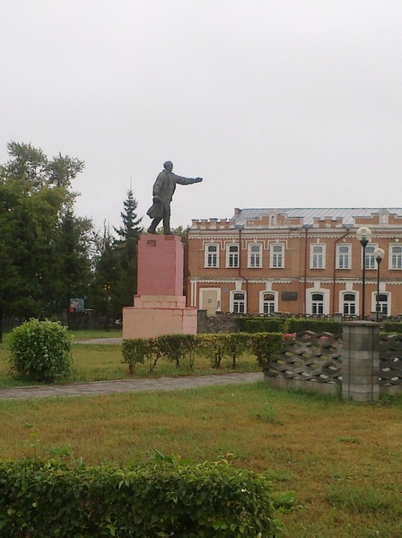 - Ещё один взгляд на памятник, с другой стороны. На заднем плане (за площадью) виден дом 3 квартала 12, хорошо знакомый всем иногородним посетителям: это главная (и, возможно, единственная) гостиница в городе.