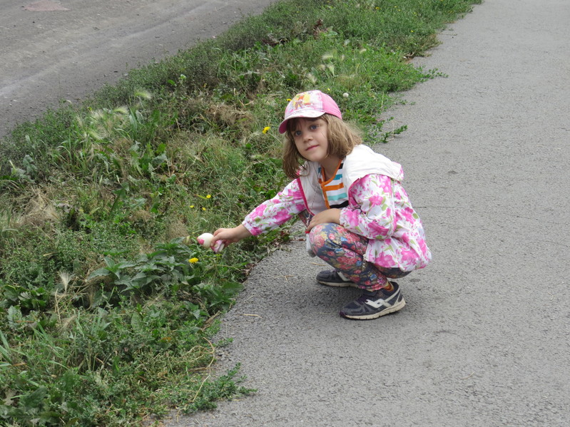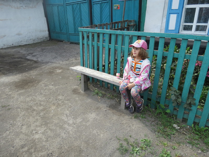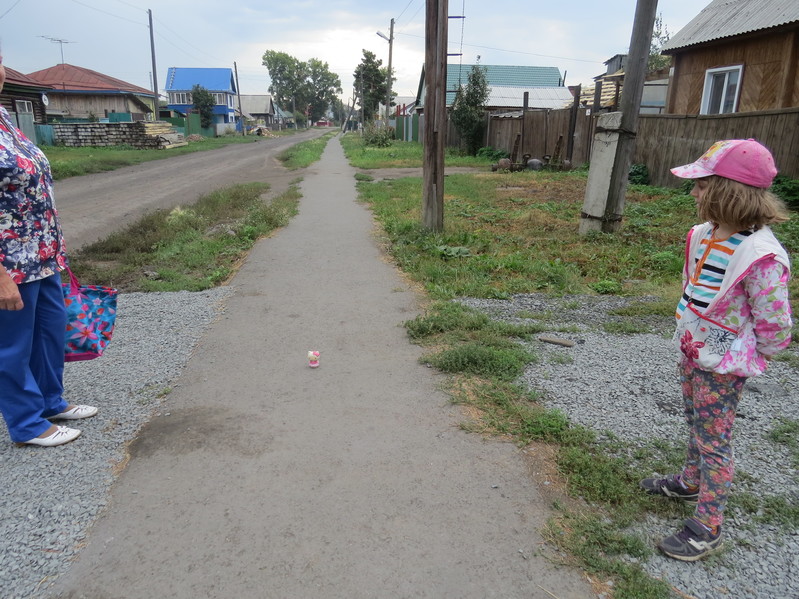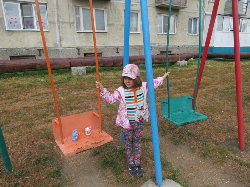 - Лизавета качает на качелях Китти, синего зайца и оранжевую пони во дворе 4-го дома 15-го квартала (то есть, со стороны улицы Лермонтова).