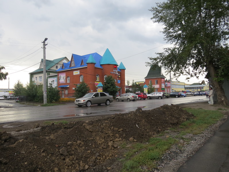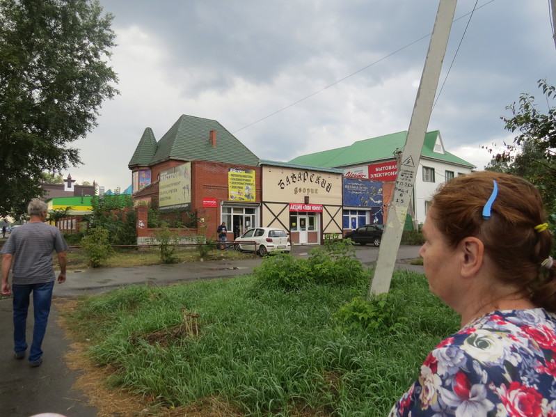 - Но вот тут пошёл дождь. На время первого сильного ливня мы успели укрыться в магазине (на следующем перекрёстке, по адресу Пугачёва-55). Потом всё же пошли дальше, но Китти спряталась в карман Лизаветы: дождик ещё немного капал... На фото: магазин "Под часами" (Володарского-33), расположенный на перекрёстке улиц Володарского и Новосибирской. Справа на фото, вроде бы, автобусная остановка, но информации про эту остановку мне найти не удалось. Однако, известно, что остановка примыкает к ларьку с видео-прокатом, который называется "Другой мир"...