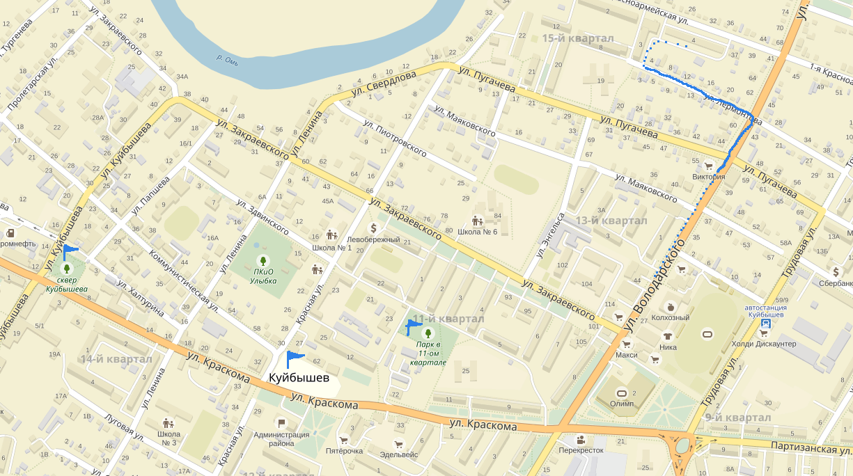 - Прогулка 5 у нас, честно говоря, не задалась. По плану эта прогулка и так должна была бы существенно отличаться от предыдущих прогулок, потому что эта была прогулка по другому городу: Лизавета и Китти приехали в Куйбышев Новосибирской области. Но, к тому же, нам не повезло с погодой. Были сильные дожди. И даже в тот момент просветления на небе, когда мы всё же выбрались на прогулку по окрестностям, начался дождь, так что прогулка получилась совсем небольшой. Тем не менее, мы решили дополнить историю об этой прогулке другими фотофрагментами из этой поездки. На карте обозначен маршрут нашей прогулки по Куйбышеву, а так же флажками обозначены другие места, в которых мы фотографировались в эту поездку. Кроме того, здесь есть фотографии из Новосибирска и Барабинска. Фотографии были сняты с 27 по 30 августа 2016 года...