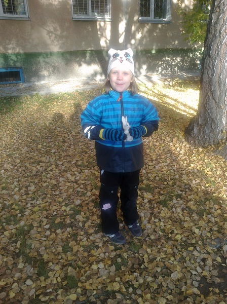 - 26 сентября Китти не гуляла. Зато в садик ходил её приятель, заяц Сашка. На фото: Лизавета с зайцем Сашкой по дороге из садика (на фоне дома Вокзальная-8).
