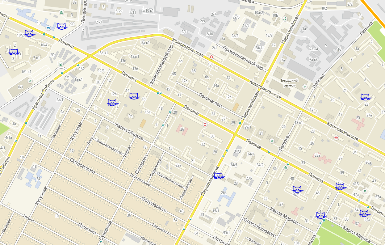 На карте обозначены места города Бердска, где фотографировалась Китти.