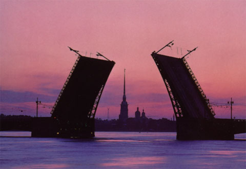 Еще о лампочках. :) Практически везде, за редким-редким исключением, помещения освещаются встроенными в фальш-потолки маленькими лампочками. Это настолько повально, что мы перестали восхищаться этому в первый же день, а удивляться -- на второй. Домой!В конце-концов мы дожили и до обратной дороги. :) При взлете я увидела-таки то, что Алешка пытался показать мне при посадке -- это ночной Санкт-Петербург с высоты. Учитывая исправно горящие фонари, вдоль всех дорог, это совершенно изумительное зрелище... Открытка. Еще одно изумительное зрелище, увиденное нами, правда, только на открытке... :) При нас мосты еще не начали разводить, холодно еще... :)