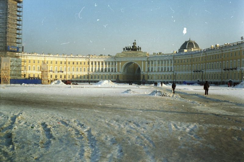 Дворцовая площадь с Триумфальной аркой и колонной в лесах.